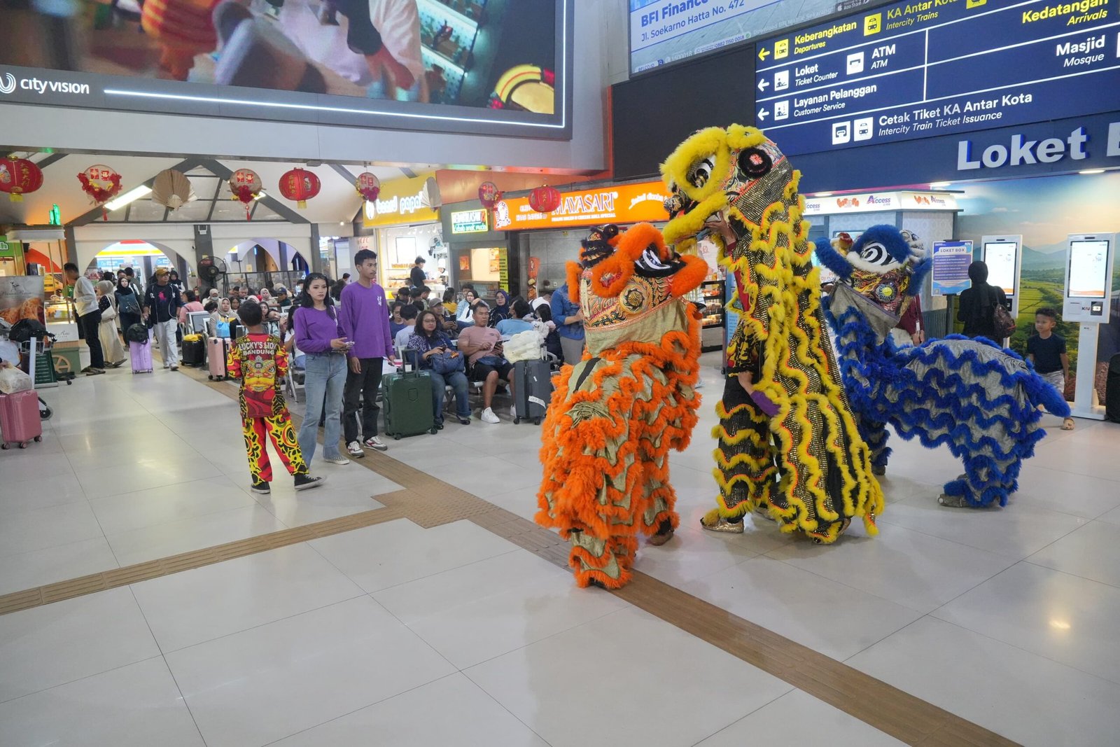 Suasana semarak tampak menghiasi area pelayanan penumpang dengan dekorasi lampion merah, pernak-pernik bernuansa emas, serta ornamen shio yang menambah semangat perayaan bagi para pelanggan yang bepergian menggunakan kereta api.