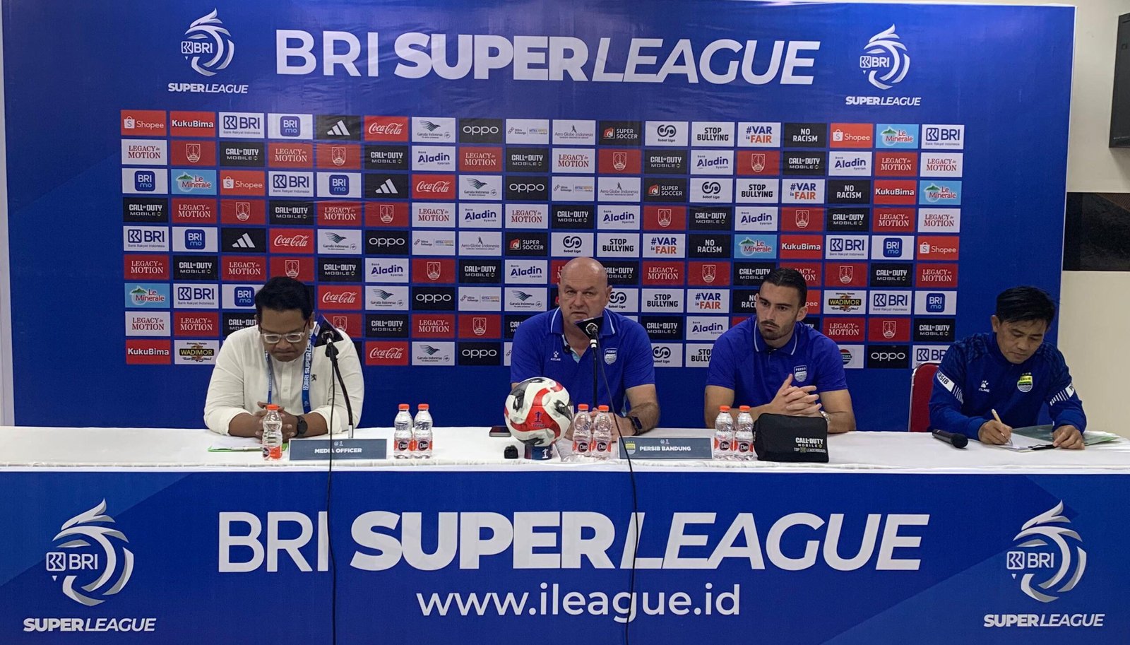 Bojan Hodak dalam sesi jumpa pers usai laga Persis vs Persis. Di sana ia menjelaskan tentang adanya perubahan jadwal kontra Borneo FC. (Media Officer Persib)