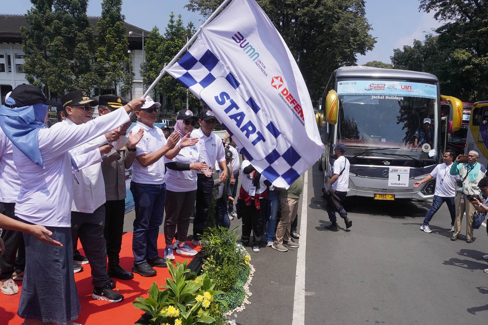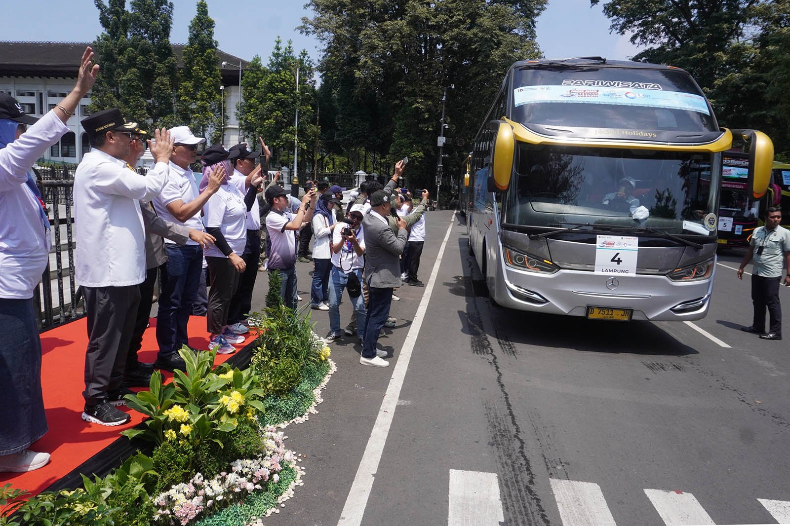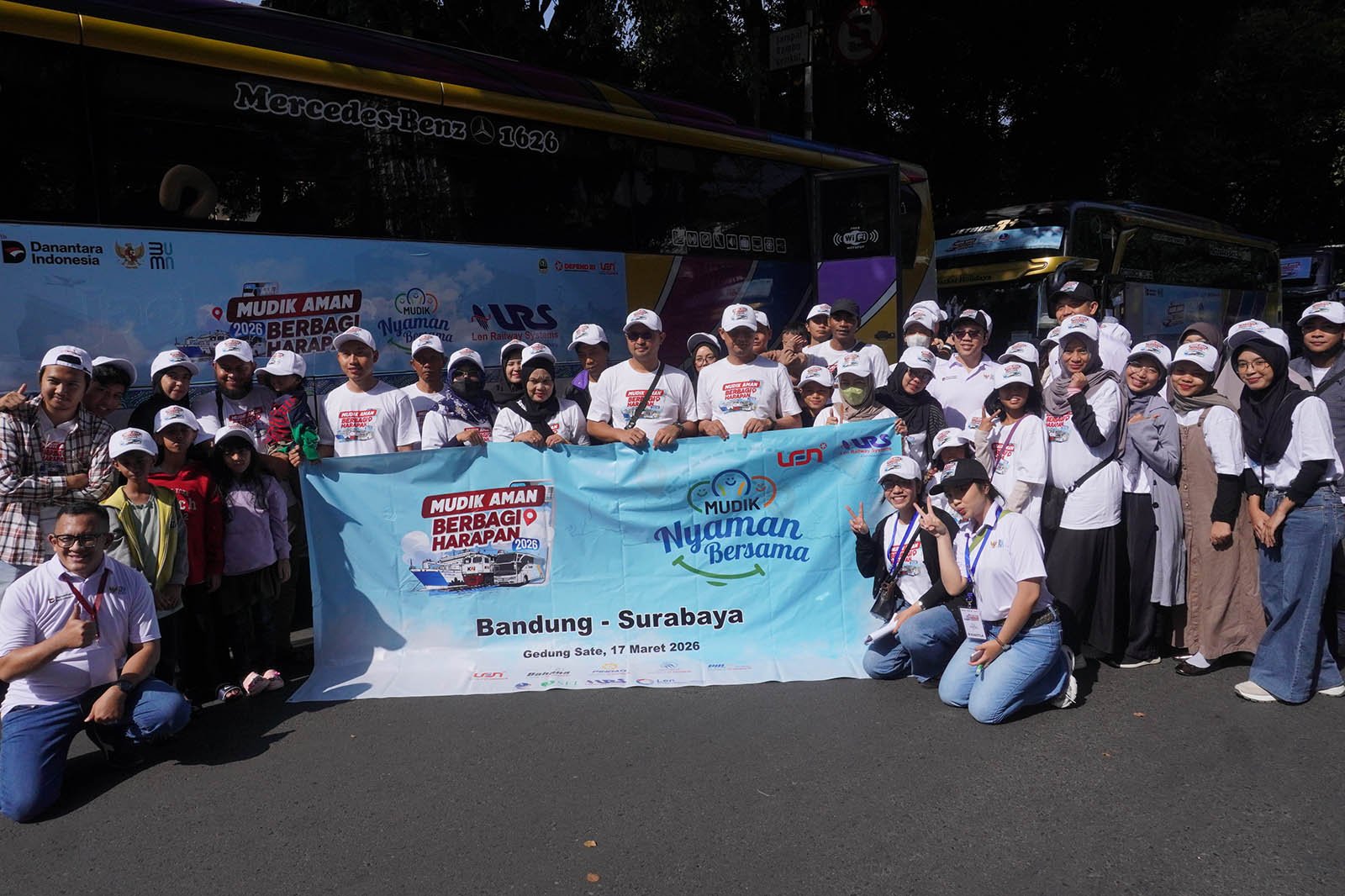 Pelepasan keberangkatan pemudik dilakukan secara simbolis dari Gedung Sate, Kota Bandung, Selasa, 17 Maret 2026, oleh Direktur Teknologi & Manajemen Risiko PT Len Industri (Persero), Amalia Maya Fitri, bersama Wakil Gubernur Jawa Barat, Erwan Setiawan, yang secara resmi melepas rombongan bus menuju berbagai kota tujuan.